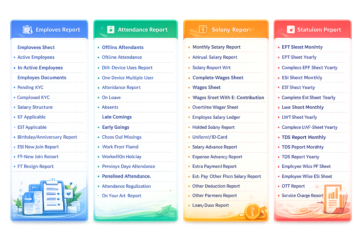 - Reports: Attendance, Leave, Payout, Salary Slips, Tour.